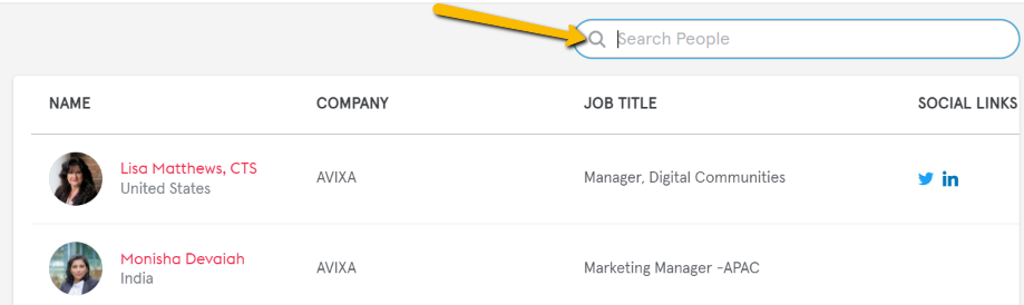 Once opened, you can start by selecting country and then use the “Search People” field to find everyone matching your query. The search results will yield anyone with the search term as their title or in their “About” description (a great reason to complete your profile! How to Set Up Your Personal Profile! | AVIXA Xchange ). This allows you to search by expertise, specific capabilities, company name and more.