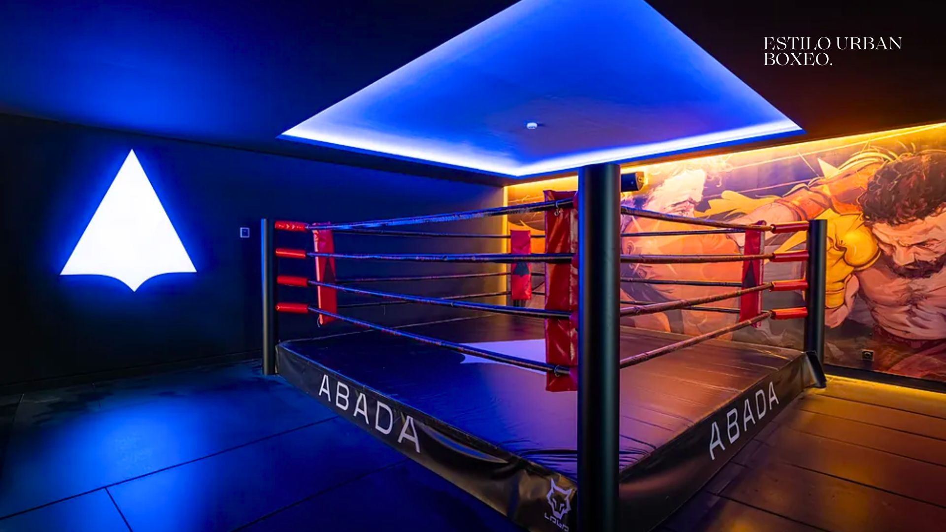 🥊 Urban Boxing: Bolsas de boxeo retroiluminadas y un ring vibrante donde la luz reacciona al ritmo de cada golpe. El logo “AA” se convierte en un símbolo de potencia.