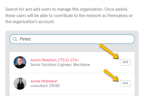 5. A panel will open on the right and you may begin typing a name. Once it populates, select “Add” and the next time that person logs in to Xchange, they will be able to “switch account” and admin the company profile!