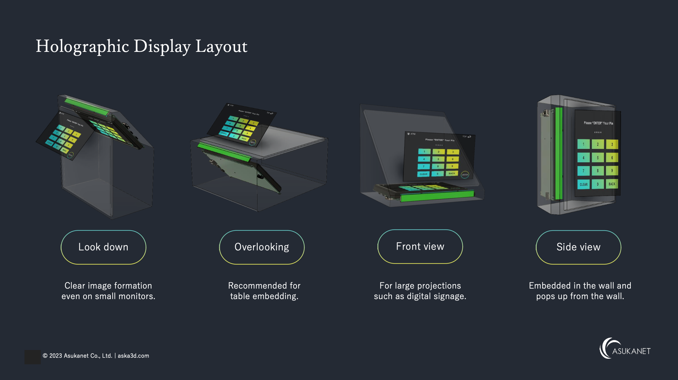 As the holographic display using ASKA3D technology are generated by simply using ASKA3D plates which is the special transparent plate that reflects light, it can allow various different layout for locational set-up. It’s in Japanese language only, so international viewers need to use the auto-translation of YouTube. But you can watch the video that ASKA3D team member explained about the different layout ideas in our past seminar by clicking the above image. It’s namely as below: