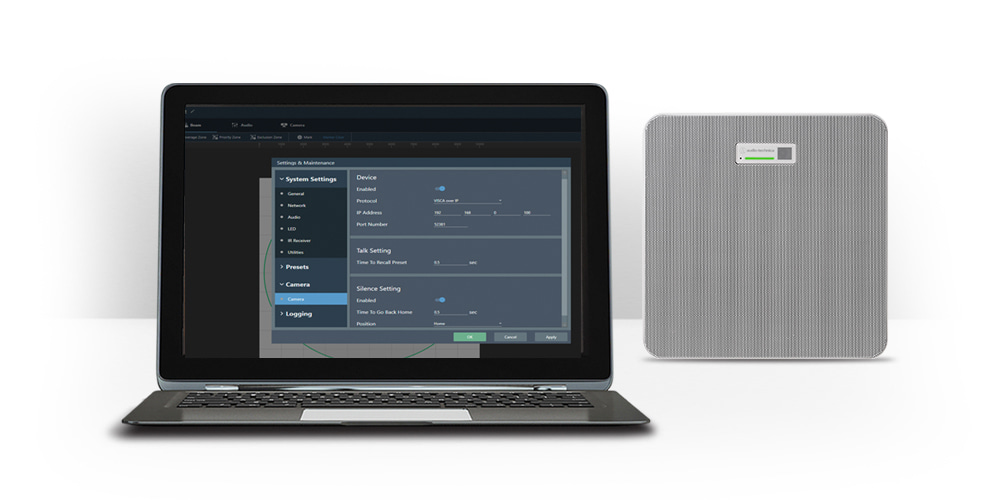 The Digital Microphone Manager software from Audio-Technica makes it easy for end users or integrators to program presets. You can set up microphone placement, identify audio pickup zones, set room size and dimensions, and draw in camera areas to be trigger points. Then you link to the camera and enable VISCA over IP by entering the IP address of the camera.