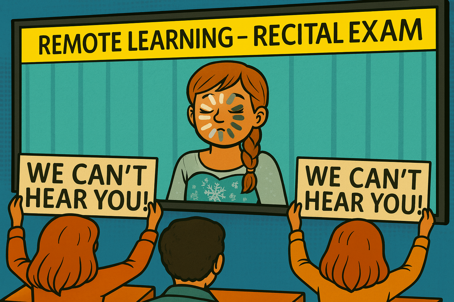 In a recital exam, a student appeared stuck mid-blink on screen—FROZEN by a poor connection. Ironically, she was all dressed up for the big moment. Hybrid learning has its challenges, and tech glitches like laggy video or dropped audio can undo hours of preparation. A strong network and stable setup are just as crucial as the performance itself.