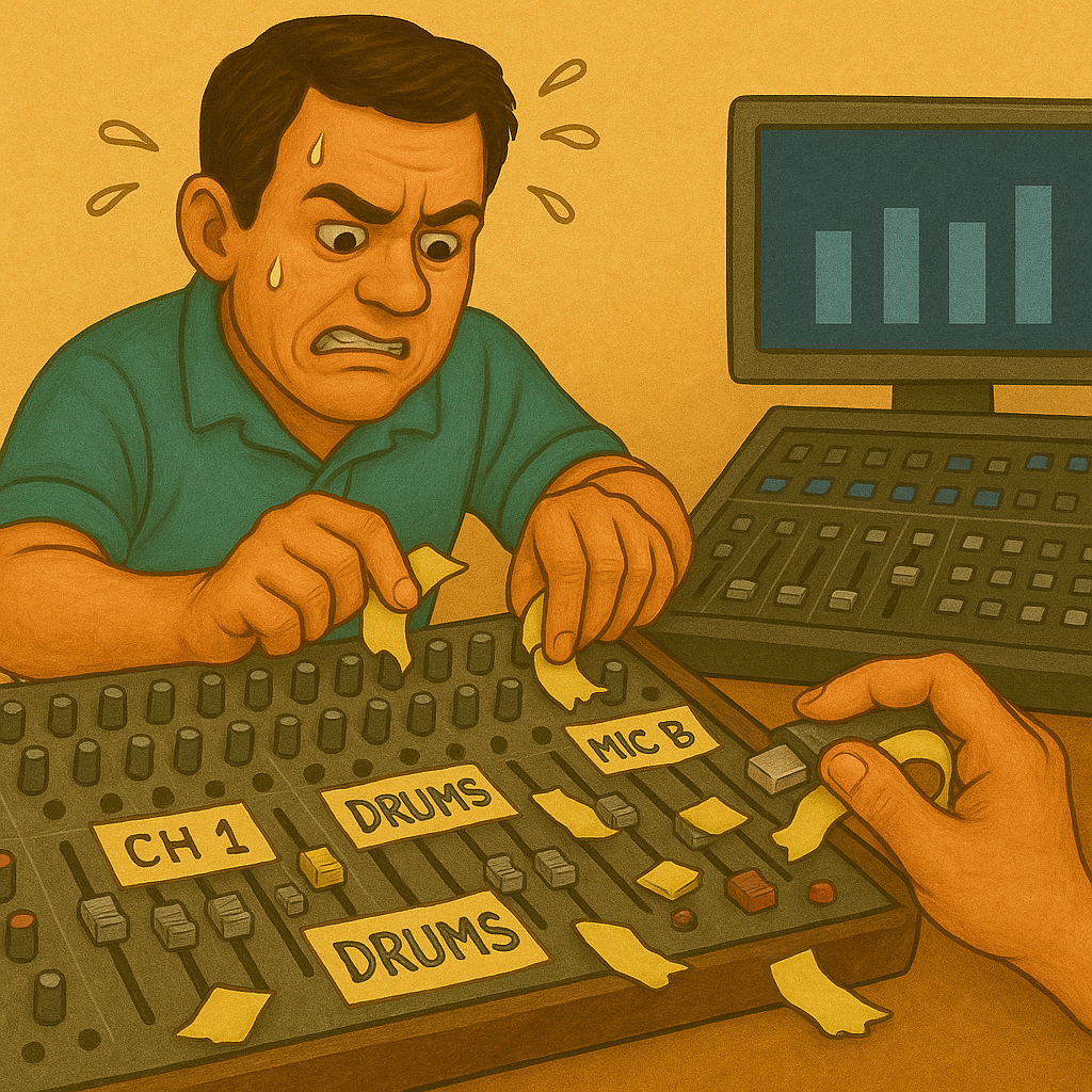 Throwback to the days of labelling every single fader on an analog mixer with masking tape and a marker. It was part of the setup ritual—neat handwriting was a bonus! With digital mixers now, channel labels are on-screen—clean, quick, and no more scribbling mid-show.