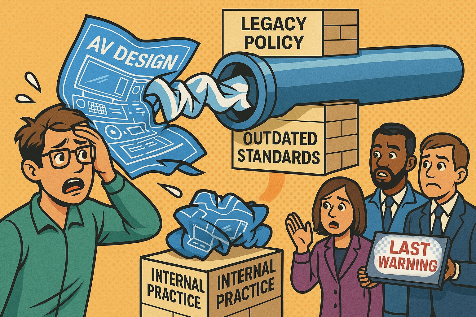 Working on AV design in an enterprise setting often comes with unexpected roadblocks. You might spend days crafting a solid, modern solution, only to be told it doesn’t fit with an old internal policy or outdated company standard. Sometimes it’s legacy habit, other times it’s just “the way things have always been done.” It can be frustrating when your effort gets stuck not because of the design itself, but because of internal practices that haven’t kept up. Navigating this takes more than good design—it also takes flexibility, communication, and a bit of patience.