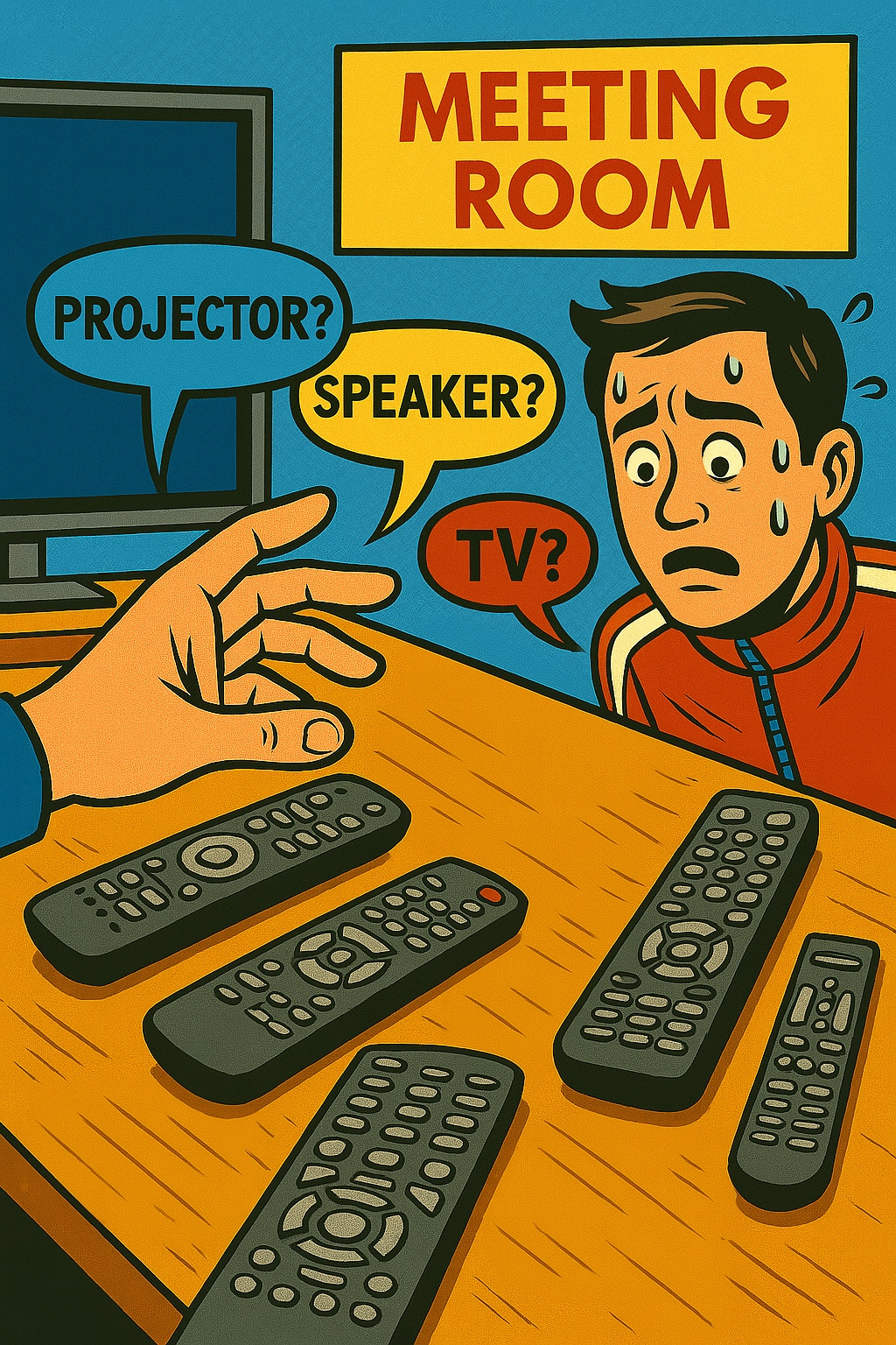 Five remotes on the table and no clue which one to use—classic meeting room confusion. Meeting rooms should be intuitive, not intimidating. A single, easy-to-use control system keeps things smooth, fast, and frustration-free.