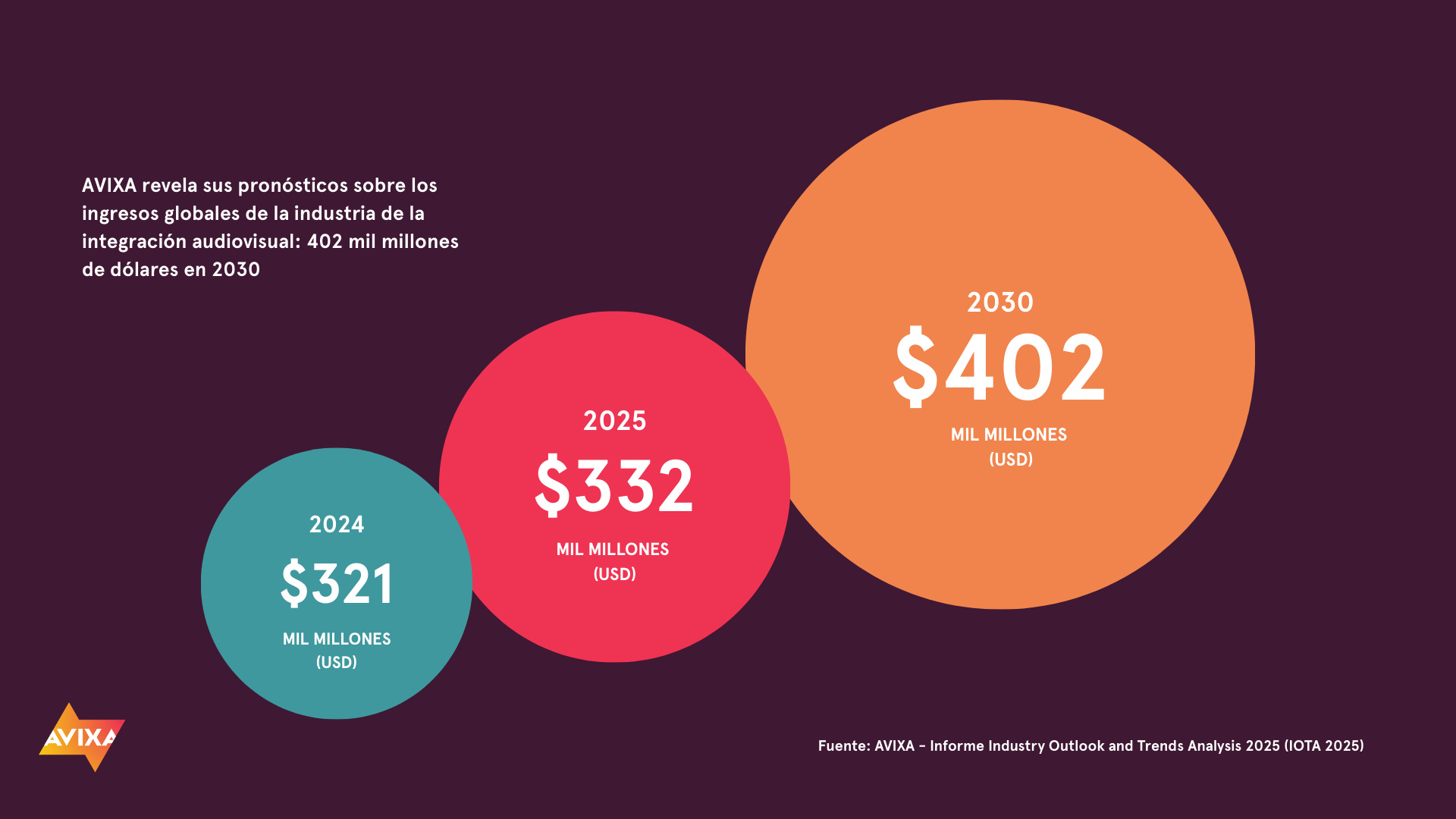 El nuevo informe Industry Outlook and Trends Analysis 2025 de AVIXA (Audiovisual and Integrated Experience Association) proyecta que los ingresos globales de la industria de la integración audiovisual crecerán de los 332 mil millones de dólares esperados al cierre de 2025 a una cifra de 402 mil millones en 2030. Este pronóstico de incremento de 70 mil millones de dólares en los próximos cinco años es una muestra de la resiliencia del sector, a pesar de que los ingresos de 2024 resultaron por debajo de la cifra prevista en el reporte anterior: 321 mil millones de dólares, en contraste con los 325 mil millones de dólares señalados en el IOTA 2024.