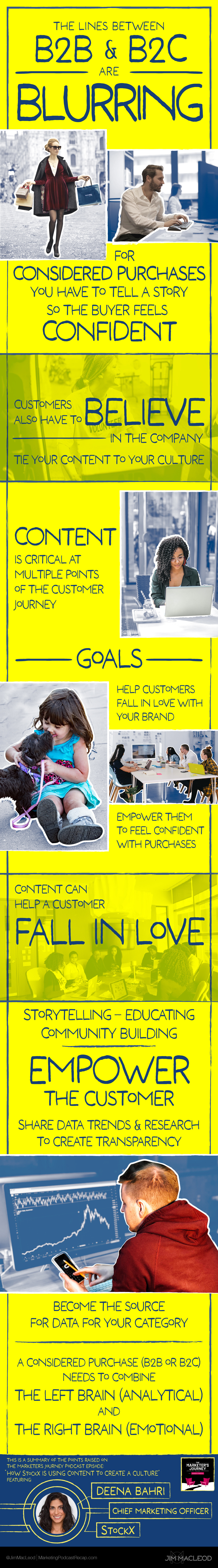 Jim MacLeod, in a recent marketing podcast recap (see infographic below), explores how the lines between B2B and B2C blur in considered purchases, and how businesses in both areas need to combine analytical (B2B) and emotional (B2C) approaches to succeed.