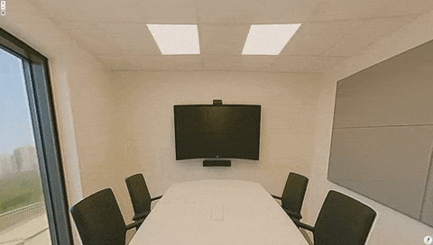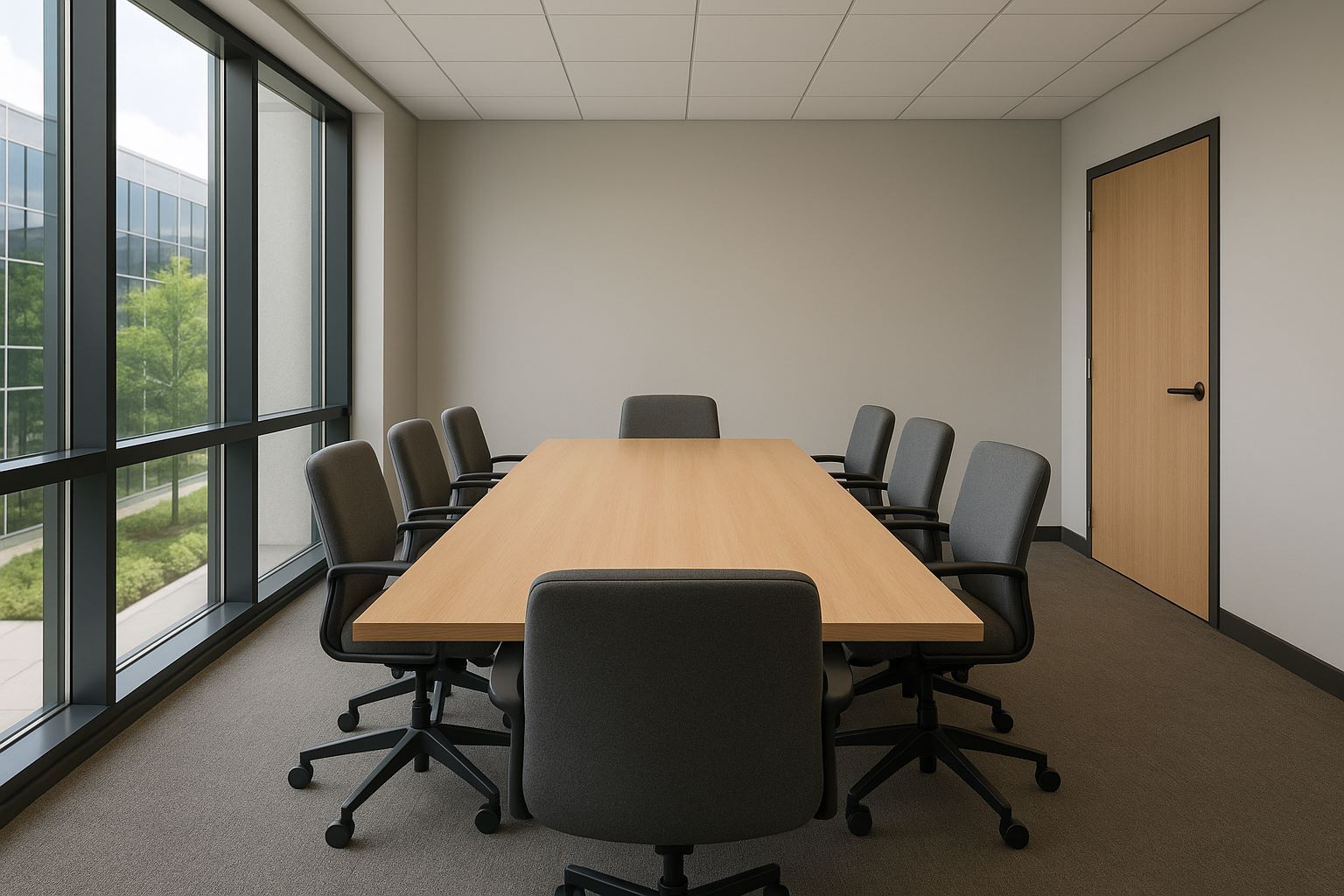 2. Prompt: "Please create a 3D render of a meeting room based on the attached room plan. The left side of the meeting room should be a glass facade (floor-to-ceiling glass panels)."