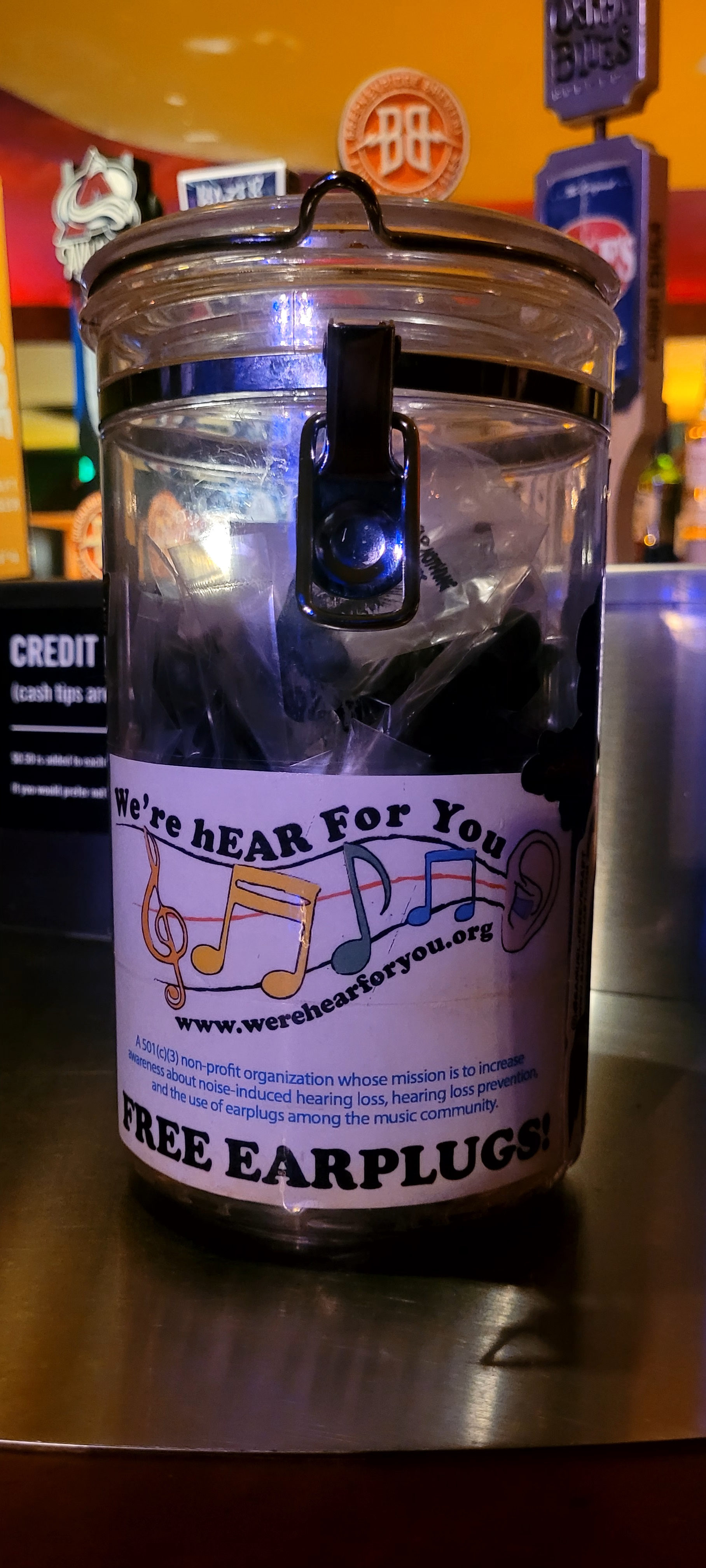 Recientemente estuvimos en un concierto en Denver y me llamó la atención un jarro sobre la barra con un letrero mostrando su interés por nuestros oídos, contenía protectores auditivos, estaban disponibles para quién los necesitara, me pareció una acción muy amable por parte del establecimiento Gothic Theater. Anteriormente había visto gente en conciertos y festivales en estados unidos y Europa utilizar protectores pero nunca que fueran gratuitos a cuenta del foro, no se si esto sea una practica común en otros lugares.