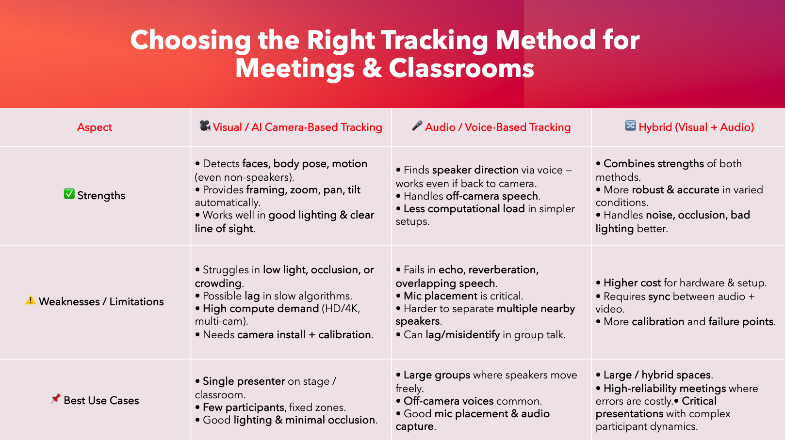 In today’s hybrid work and learning environments, tracking technologies play a critical role in delivering seamless meeting experiences. From classrooms to boardrooms, the choice between AI camera-based, audio/voice-based, or hybrid solutions can significantly impact engagement, clarity, and inclusivity.