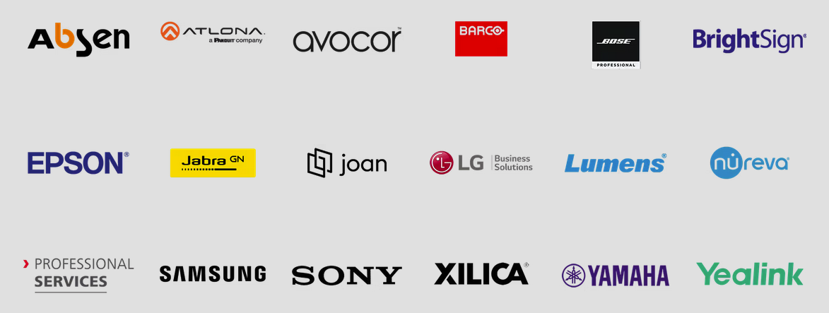 Absen | Atlona | Avocor | Barco | Bose Professional | BrightSign | Epson | Jabra | Joan | LG | Lumens | Nureva | Professional Services | Samsung | Sony | Xilica | Yamaha | Yealink