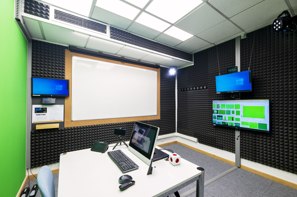 El Estudio Uno está diseñado para la producción de webinars, contenidos de formación, o presentaciones de producto, desde un unboxing hasta una guía de operación paso a paso. Al estar automatizada es ideal para un solo presentador, que inclusive puede optar por convertirse en su propio realizador, pues la sala ofrece un panel de control para gestionar las seis cámaras disponibles o la reproducción de diapositivas y pedales de cambio de escenario para aprovechar el fondo chroma o su amplia pizarra para anotaciones.