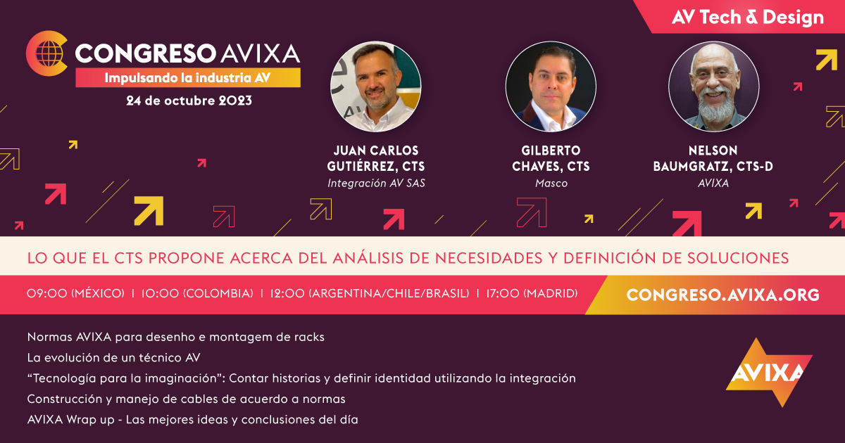 Quiero contarles que estaré hablando en el congreso AVIXA Latinoamérica el 24 de octubre de 2023 a las 10:45 am junto con Nelson Baumgratz, CTS-D y Gilberto Chaves Mesen. El título de nuestra charla es: Lo que el CTS propone acerca del análisis de necesidades y definición de soluciones.
