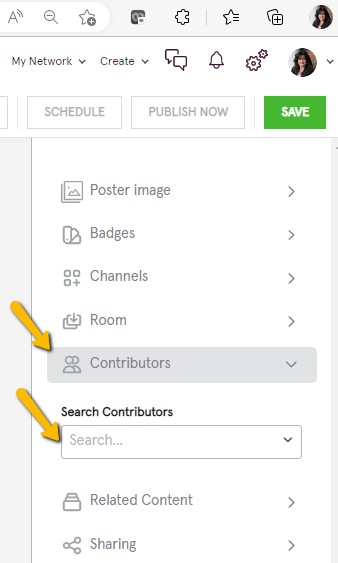 - When creating a post, the feature is located in the right-hand panel just below the Channel and Room tabs. Click “Contributors” and begin typing a name into the search box. Select the individual or organization once it appears.
