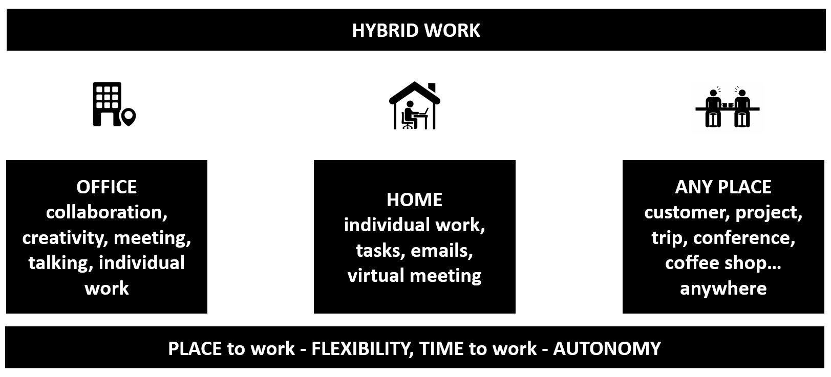 Thanks to digital collaboration, it is not necessary to group employees by "location", but by the "problem" they are working to solve. Teams work through digital tools and communication platforms and use physical locations as needed, such as in the office, from home, on the road or in coworking spaces.