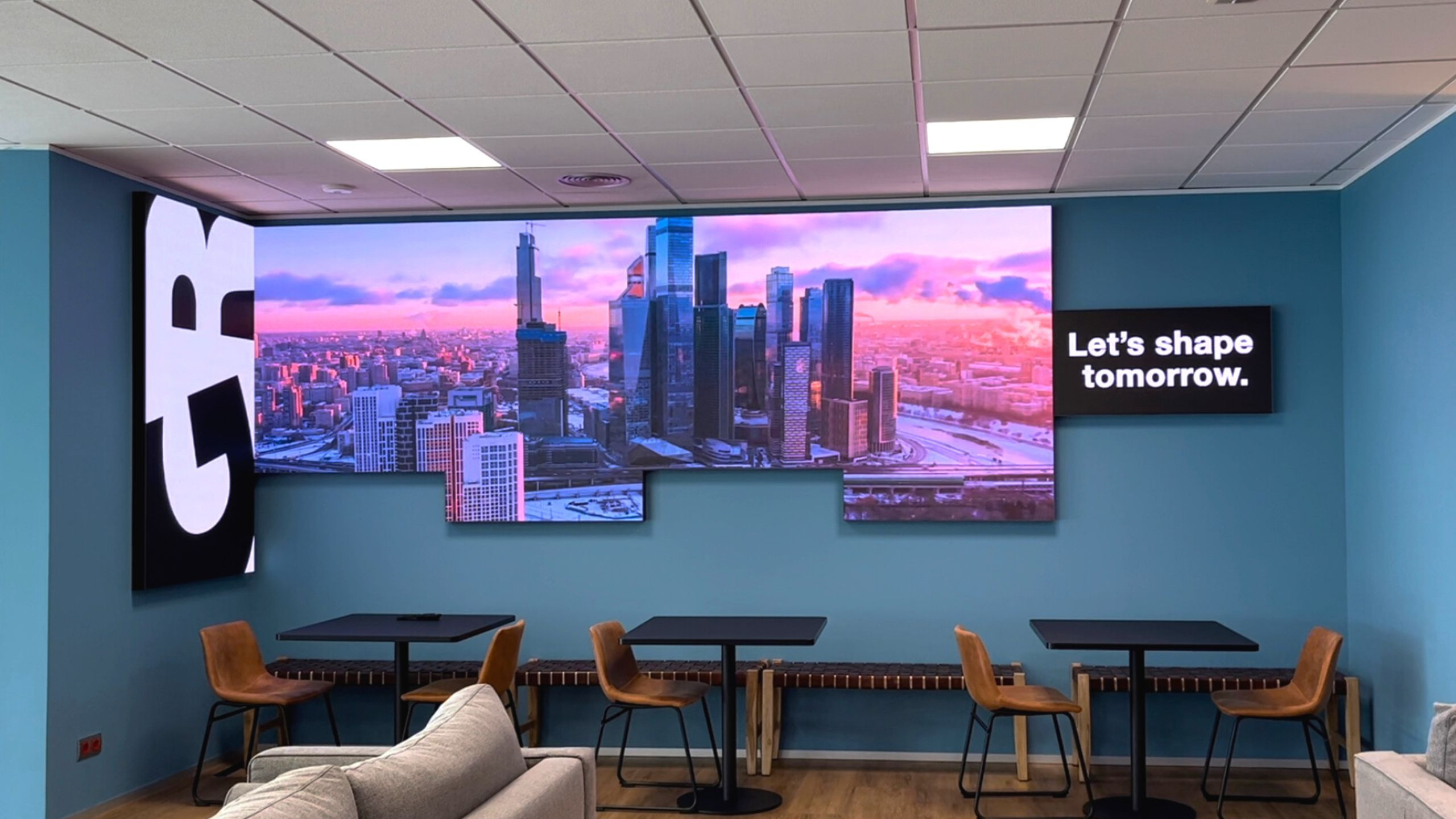 Among the implemented technologies, several high-definition LED displays in various sizes, supplied by top manufacturers like LG, Philips, Samsung, and NEC, take center stage throughout the space. LEDDREAM was selected as the trusted partner for their expertise and certifications to work with all these manufacturers.