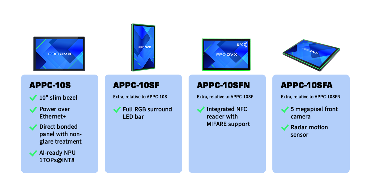 The APPC-10S is the base model, featuring a non-glare touchscreen with direct bonding, an AI-ready NPU (1TOPs@INT8) for real-time processing, IEEE 802.1X support, a powerful RK3568 processor, and PoE+ for simplified installation. This device is suitable for a wide range of organisations operating in retail, corporate, healthcare, education, logistics, and hospitality sectors.