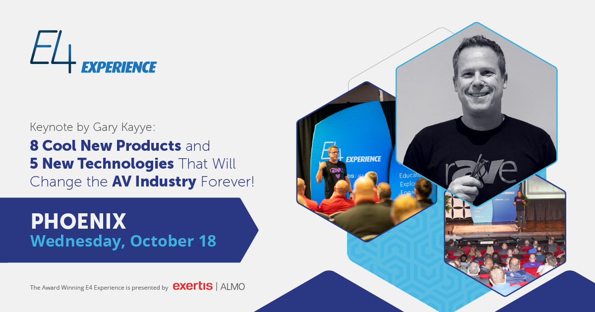 E4 Experience is the award-winning Pro AV event to attend! Join us in Phoenix AZ on October 18th for the last show of 2023. This FREE EVENT has food, networking, CTS RU training, education, the latest tech, happy hour, and more.