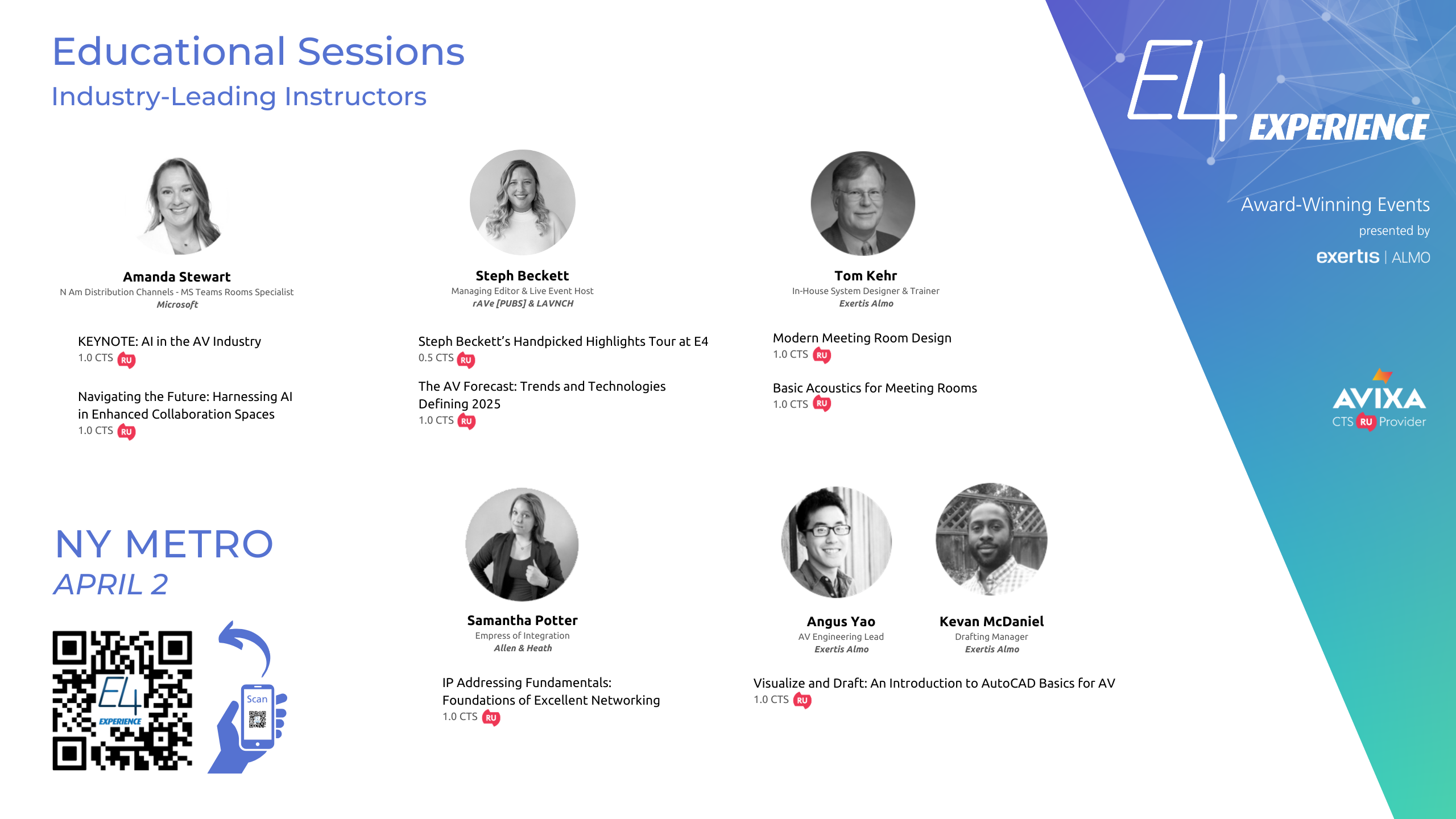 Honored with a platinum award for Best Supporting Content in the SCN 2024 Stellar Service Awards, the E4 Experience is well-known throughout the AV industry as the most valuable, free, one-day traveling education, training, and AV tech expo for Exertis Almo resellers, integrators, consultants and their end users.