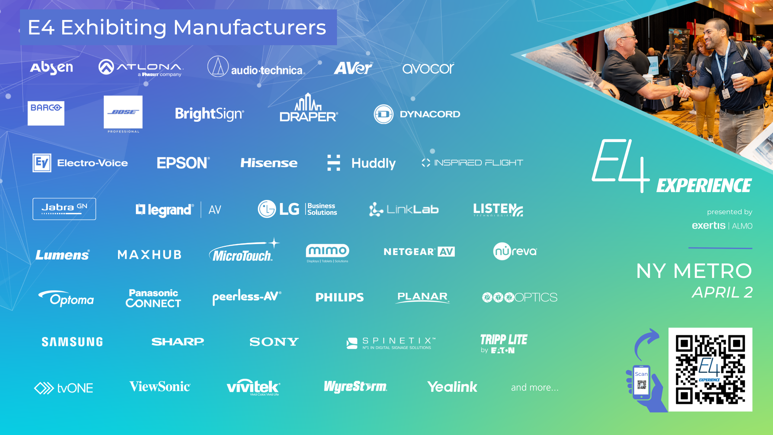 Honored with a platinum award for Best Supporting Content in the SCN 2024 Stellar Service Awards, the E4 Experience is well-known throughout the AV industry as the most valuable, free, one-day traveling education, training, and AV tech expo for Exertis Almo resellers, integrators, consultants and their end users.
