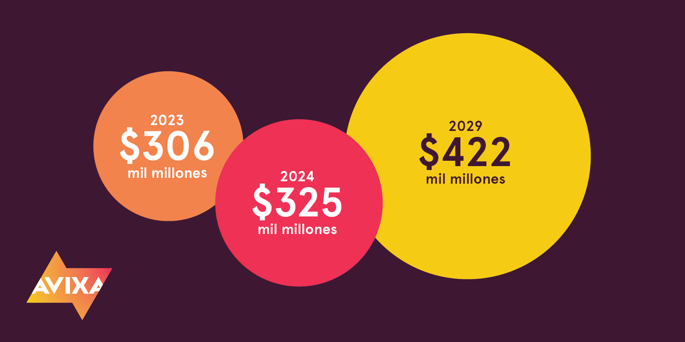 La industria de la integración de experiencias audiovisuales se encuentra en una trayectoria de crecimiento constante, impulsada principalmente por la llamada “economía de las experiencias”, que requiere soluciones tecnológicas para la producción de eventos en vivo (desde un congreso o la ceremonia de una boda hasta un megaconcierto) y el equipamiento de todo tipo de recintos (desde un auditorio universitario o un templo religioso hasta un museo o una arena deportiva). Según el último informe Industry Outlook and Trends Analysis 2024 (IOTA) realizado por el equipo de Market Insight de AVIXA, se prevé que los ingresos globales de la industria alcancen los 422 mil millones de dólares (MMD) en el 2029, un aumento significativo en comparación con los 306.4 MMD registrados en 2023.