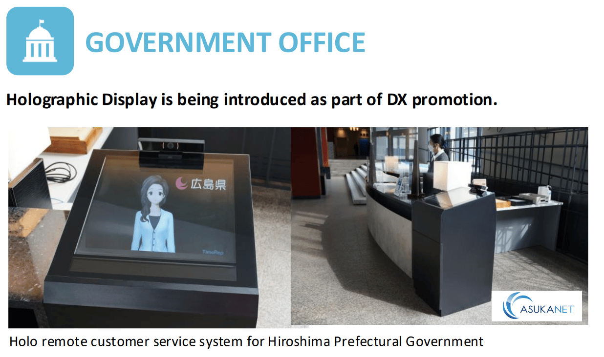 Here’s another example of contactless technology that’s implemented in Japan. In Hiroshima Prefectural Government building, they adopted holographic remote customer service system at the reception desk. The visitors can select menu and find the contact in the mid-air without touching any physical buttons or touchscreens, then animated avatar shows up and the visitor is able to speak to the avatar. It’s because of the ASKA3D holographic display technology that the avatar shows up in the mid-air, the visitors can experience as if they are speaking to a real people. This is something new to the Hiroshima Prefectural Government and also new to the visitors who are having this fascinating experience.