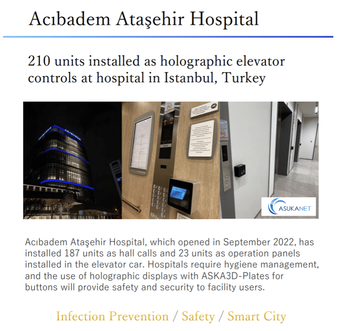 Among them, one of the most recently built hospital in Turkey “Acıbadem Ataşehir Hospital” which has been built in September 2022, has adopted th Contactless Elevator Control panels by holographic display technology in 210 units. All the people who are involved in the hospital operations such as the doctors and nurses who are working in the hospital as well as patients and their families and friends etc are all using the elevators without physically touching the buttons and touchscreens. In such a large hospital, there are people from all over the places. It is critically important to keep the entire operation as hygiene as possible. That’s the intention by the hospital management, and ASKA3D delivered it.