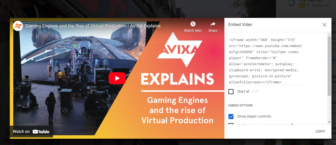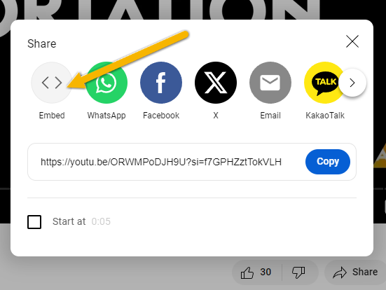 Click the Share button below the video and select 'Embed', which will allow you to copy the embed text.