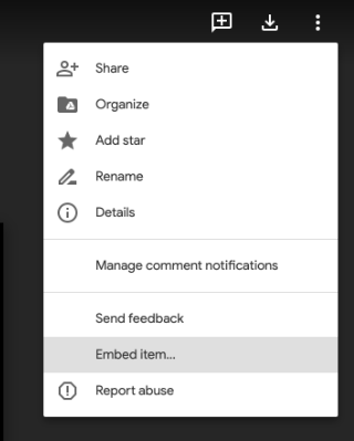 If you would like to embed a video from your Google Drive, you will first need to open the video file and click the three vertical dots in the top right-hand corner of the page. This will give you the option to Open in new window.