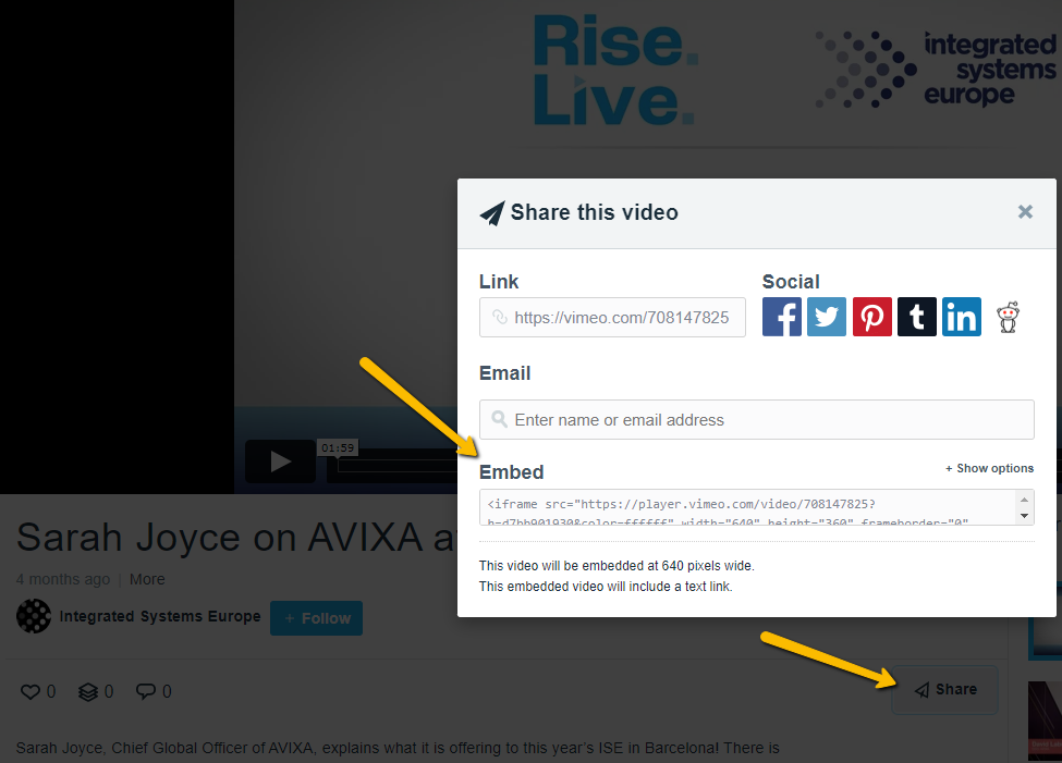 Click the Share button below the video and select 'Embed', which will allow you to copy the embed text.