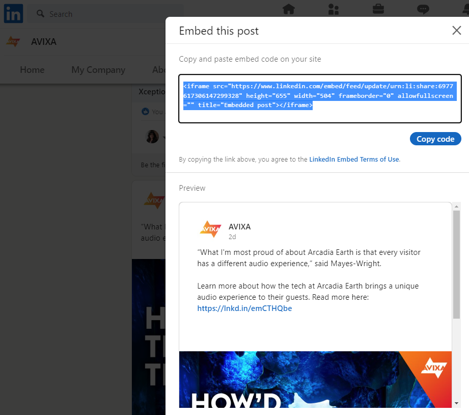 On the post you wish to embed into your content, click on the ellipses in the top right-hand corner and select Embed, which will enable you to copy the code to your clipboard, whilst displaying a preview of what the embedded post will look like.
