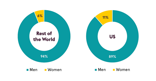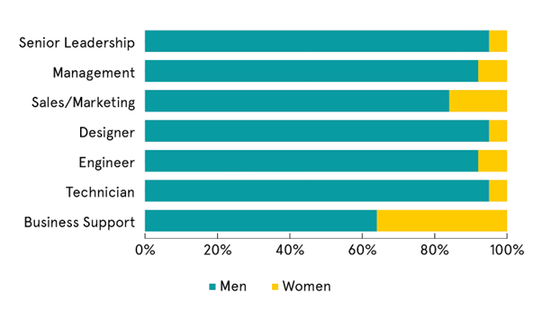 La incipiente presencia femenina se pone de manifiesto cuando se hace un corte transversal por categorías de trabajo. Todos los puestos técnicos están por debajo de la media del sector, con porcentajes que oscilan entre el 5 y el 8% en el caso de las ingenieras (entre el 6 y el 10% sólo en Estados Unidos). El porcentaje global del sector se ve apuntalado por las categorías menos técnicas, Ventas/Marketing y Apoyo Empresarial (Figura 2). Todos los datos de representación llevan a una conclusión ineludible: Las mujeres no están tan representadas en el sector audiovisual como en otras industrias.