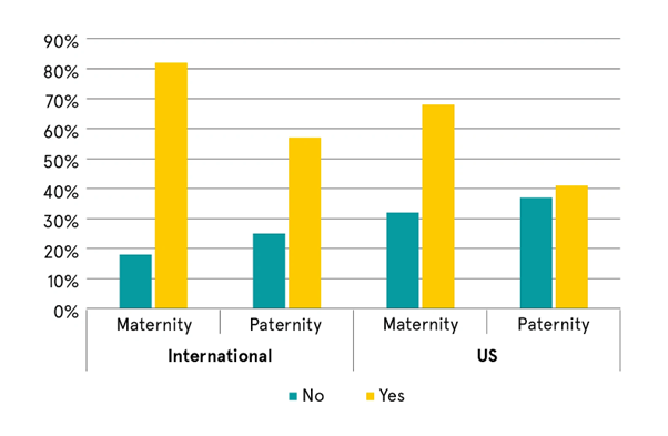 La baja por maternidad es otro factor que contribuye a la brecha en la inclusión y el avance de las mujeres. La baja por maternidad es una prestación que se ofrece a la mayoría de los trabajadores a tiempo completo1 (tanto en EE.UU. como en el resto del mundo), pero dista mucho de ser una garantía universal (Figura 3). El permiso de paternidad es menos común, ya que sólo la mitad de los encuestados en todo el mundo declaran gozar de esta prestación. Más de la mitad de los encuestados fuera de EE.UU. lo tienen (57%), mientras que menos de la mitad de los encuestados de EE.UU. lo reciben (41%).