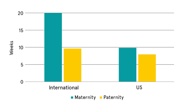 La cantidad del tiempo disponible para permisos va más allá de la disyuntiva de contar o no contar con ellos. Entre las mujeres encuestadas fuera de los EE.UU. disfrutan de normas más elevadas en comparación con sus colegas estadounidenses. En otros países las empresas ofrecen un permiso de maternidad de 20 semanas en promedio (Figura 4), mientras que en EE.UU. la baja por maternidad es aproximadamente de 10 semanas. Entre los pocos que tienen permiso de paternidad, el promedio de duración es bajo. En el resto del mundo el periodo se redujo a la mitad en comparación con el permiso de maternidad (de 20 semanas a 10). La caída comparativa fue menor en EE.UU., pero la media de 8 semanas de permiso de paternidad en EE.UU. seguía siendo inferior al promedio de 10 semanas en el resto del mundo.