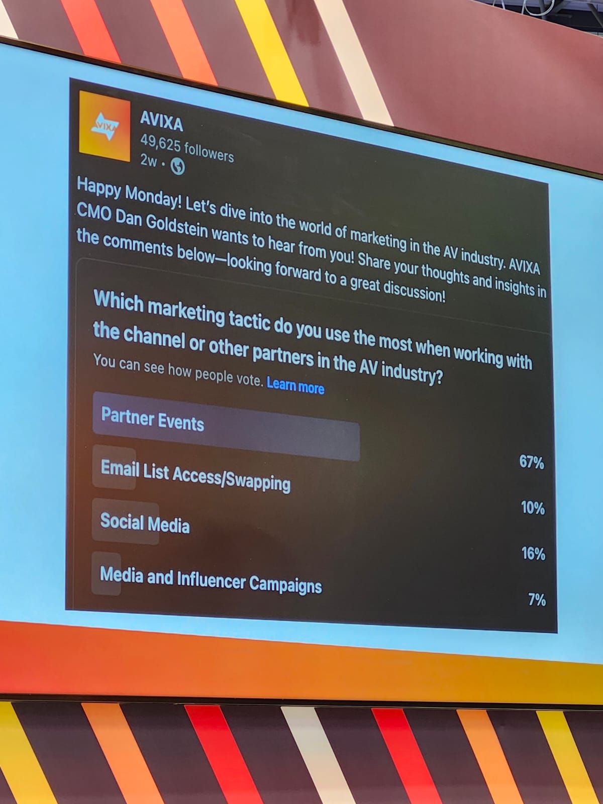 During the Integrated Systems Europe show (ISE) 2025 in Barcelona, @Dan Goldstein, Chief Marketing Officer of AVIXA, conducted an insightful session at the AV Marketers meeting, which took place at the AVIXA Xchange Live booth. The session centered around a research shared with the audience, shedding light on the most common tactics used by marketing professionals when collaborating with the audiovisual industry or other partners.