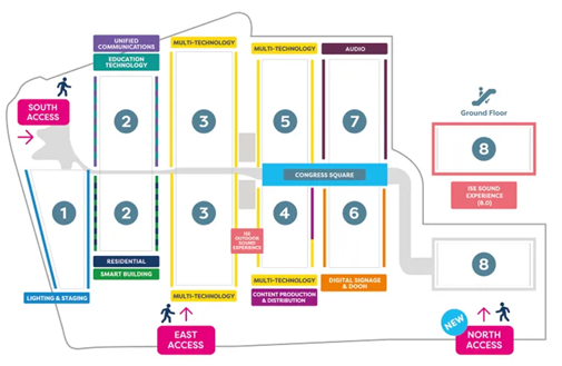 Como novedad para 2024, ISE se ha ampliado a los pabellones 1 y 4 de Fira Barcelona Gran Via. El Pabellón 1 se convierte en la nueva sede de Iluminación y Escenografía, mientras que el Pabellón 4 ofrece una nueva ubicación para Producción y Distribución de Contenido y permite ampliar la Zona Multi-Tecnología. El recinto es fácil de recorrer y está distribuido en siete Zonas Tecnológicas que ofrecen a los visitantes toda la gama de productos audiovisuales profesionales y de integración de sistemas necesarios para cualquier evento e instalación: