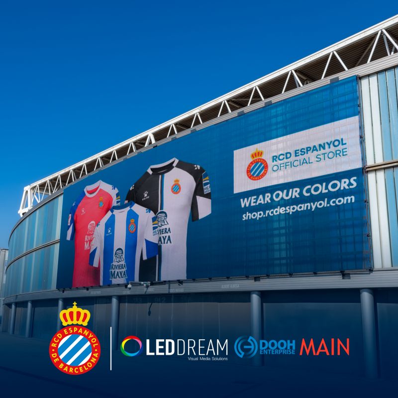 But the story doesn't end here. On February 2nd, a giant transparent screen of over 170m2 total surface area was installed on the south facade of the Stage Front Stadium, located in the metropolitan area of Barcelona. RCD Espanyol de Barcelona and the investment group Publimaes S.L. trusted LED DREAM GROUP's team for the design, installation, and content management of this prominent screen.