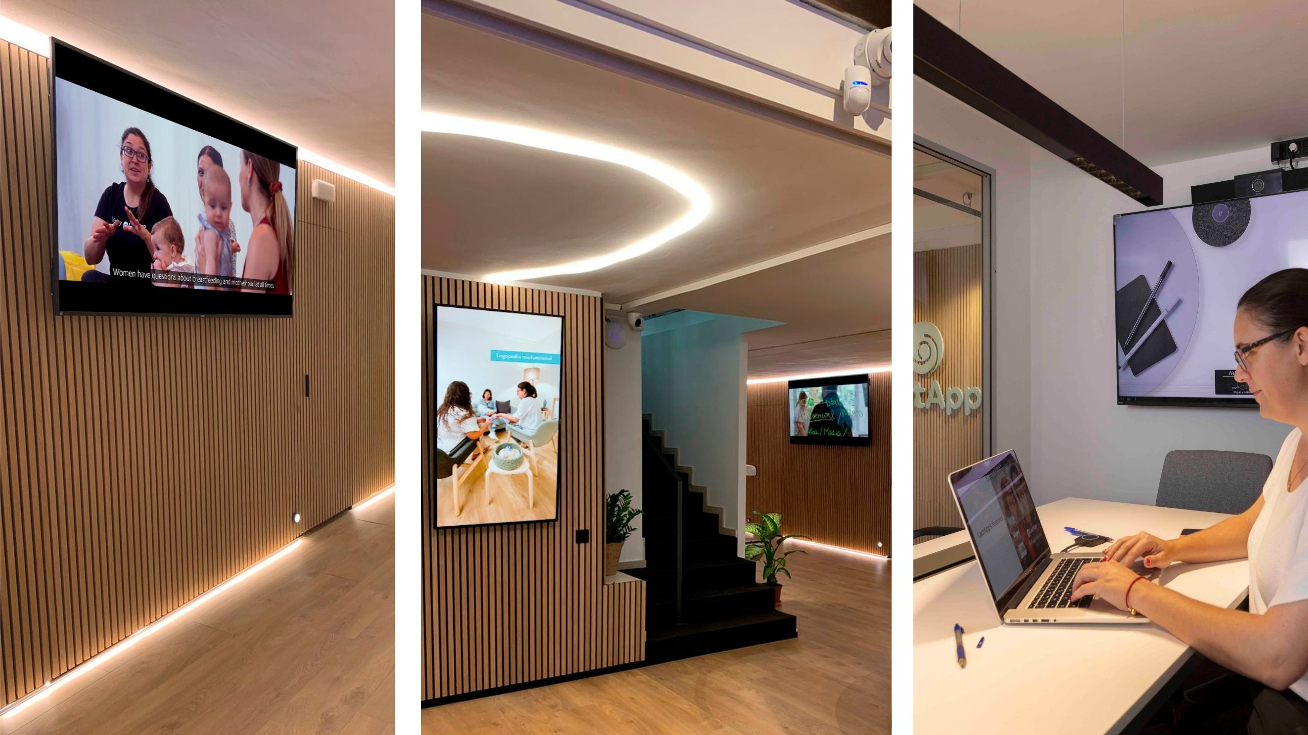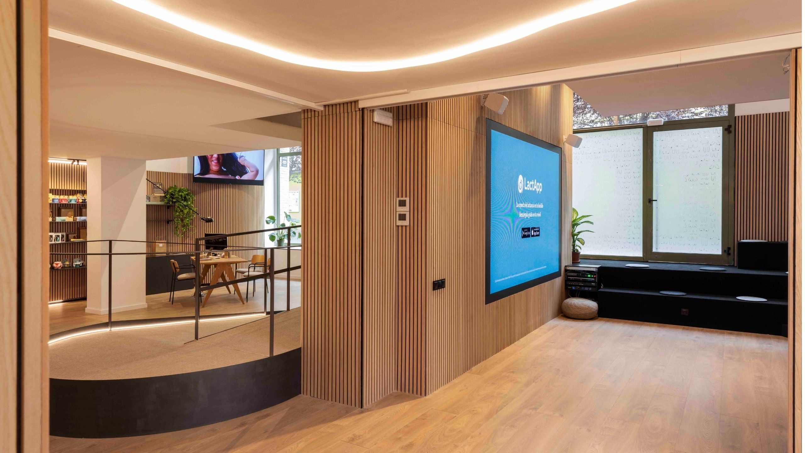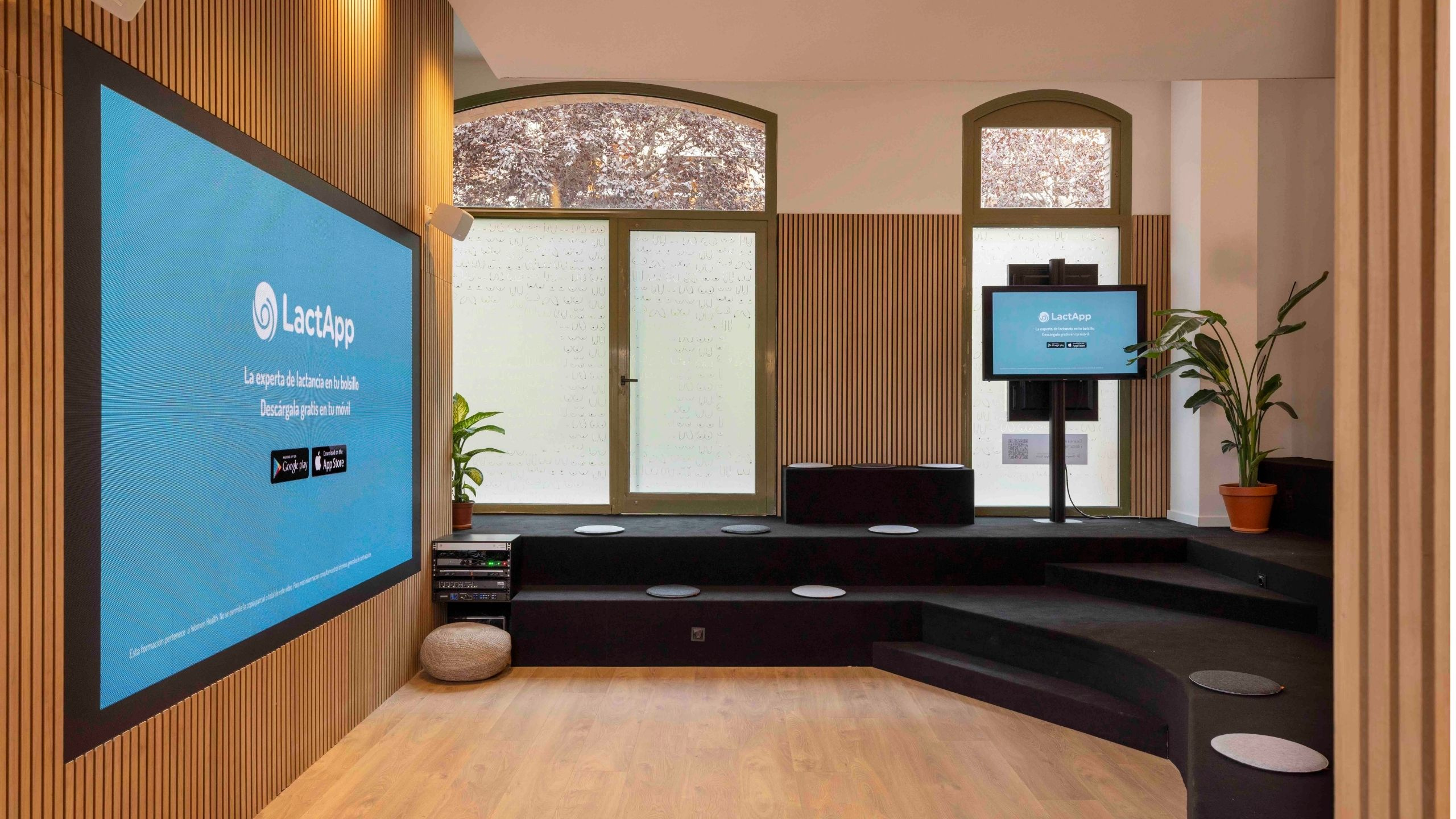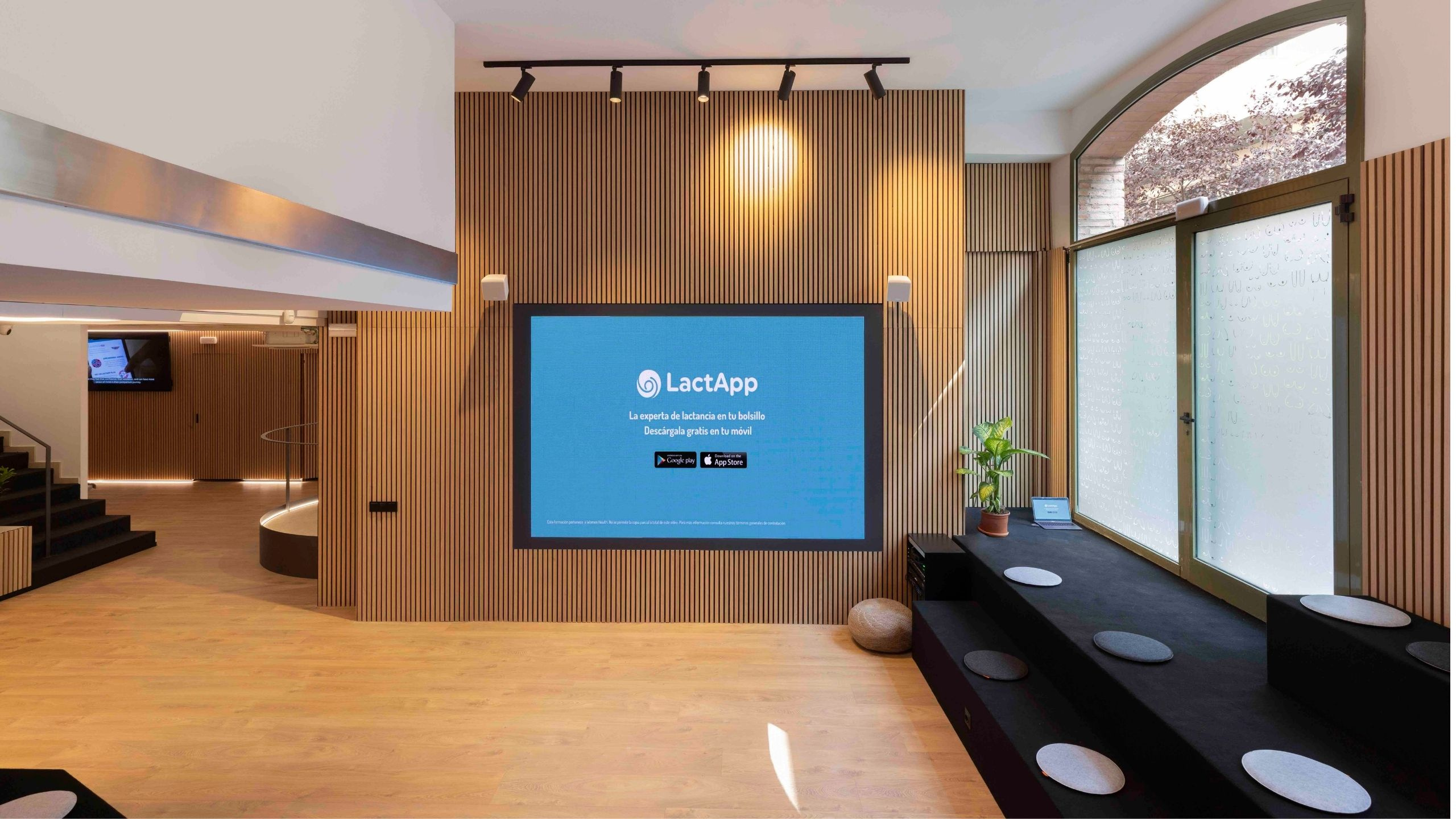 The new headquarters of LactApp is equipped with state-of-the-art audiovisual equipment strategically distributed across three interactive areas. From the modern reception area with digital signage to the impressive LED displays in the storefront, we have enhanced the existing architectural elements and combined them with cutting-edge audiovisual technology to create a comfortable and welcoming space. Every detail has been carefully considered to optimize the experience for both the team and the mothers.