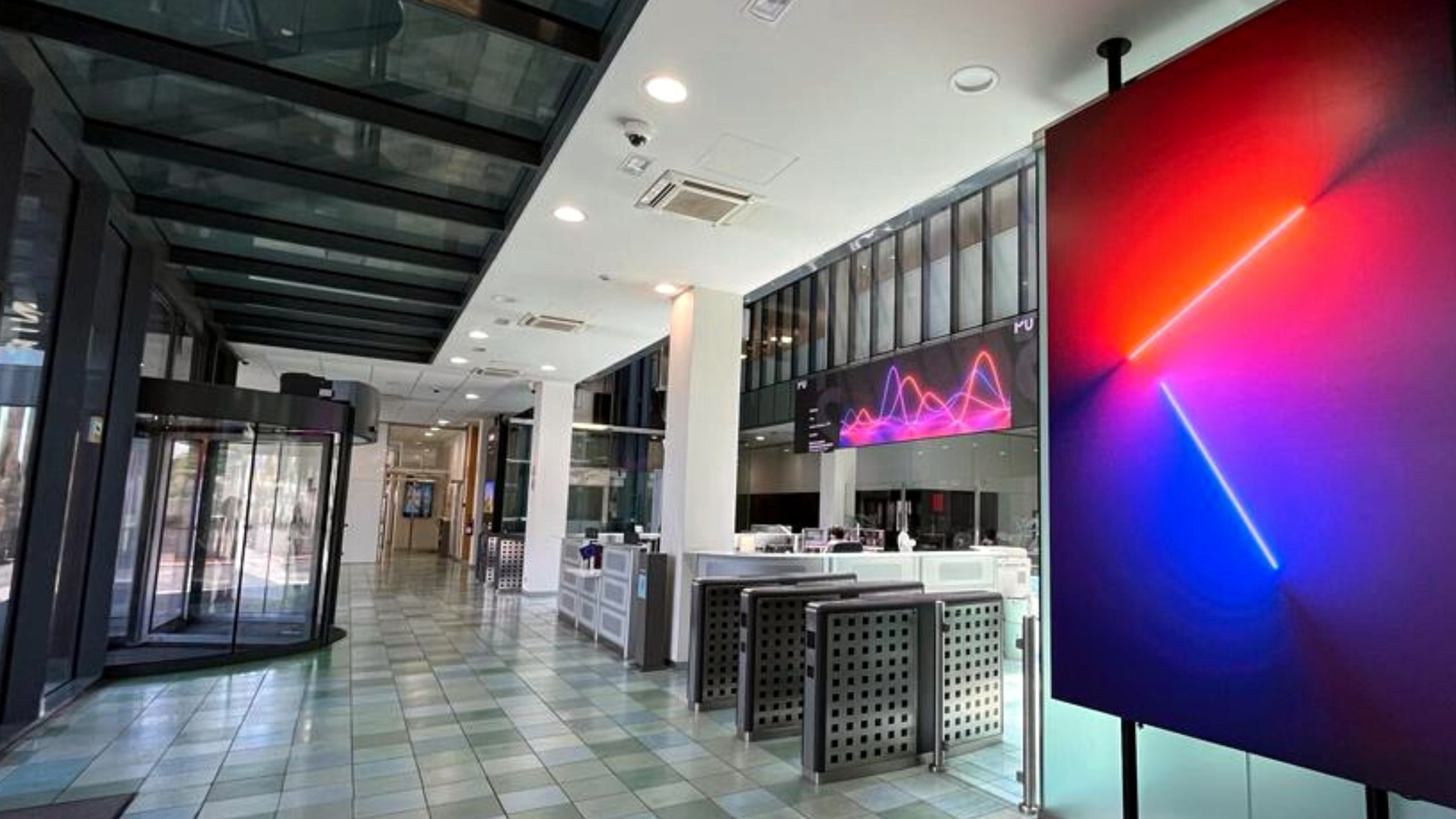 In this new hall, high-resolution LED screens have been strategically placed to display real-time information, events, and other relevant news. One of the installed screens is a Samsung LED banner format, located just in front of the building entrance, with a pixel pitch of 2.5mm, measuring 8.64m wide by 1.62m high. Its high resolution and vibrant colors bring the displayed content to life, creating an unprecedented visual impact.