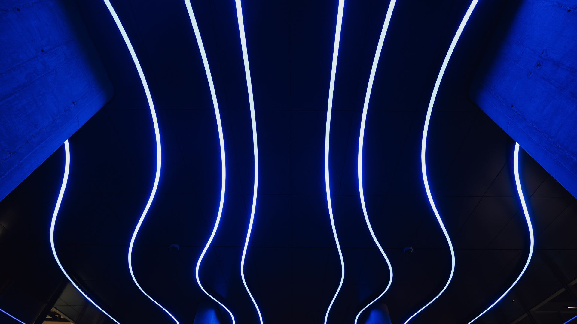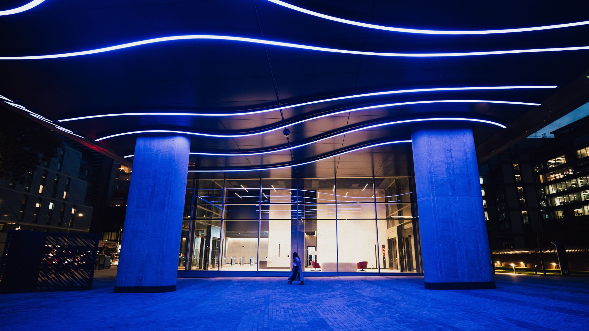 El juego de líneas luminosas configura una atmósfera envolvente y precisa, capaz de transformar la percepción del espacio a lo largo del día. Las luminarias, de alta potencia y control RGBW, suman un total de 170 metros cuadrados de iluminación digital. Gracias a un sistema avanzado de más de 7.200 píxeles de control, la iluminación controlada de manera individual puede adaptarse en color y temperatura a diferentes momentos o eventos, modulando desde una iluminación neutra y elegante hasta composiciones más expresivas. La iluminación puede transformarse, pasando de tonos neutros y funcionales a composiciones cromáticas más expresivas que refuerzan la identidad visual del edificio.