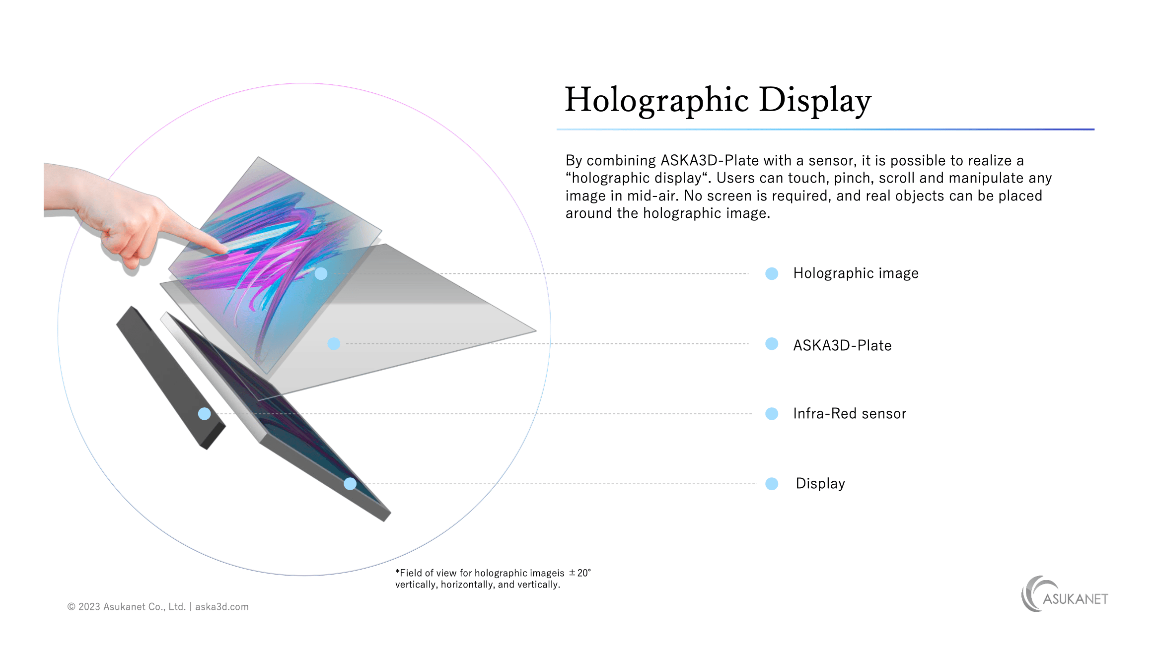 By knowing that ASKA3D plate that we invented is simply reflecting the light that’s omitted from the light source (LCD display in this case) to the other side of the plate, we think that easily makes sense. Now you can see how simple and how easy it is to actually create holographic display by using ASKA3D technology.