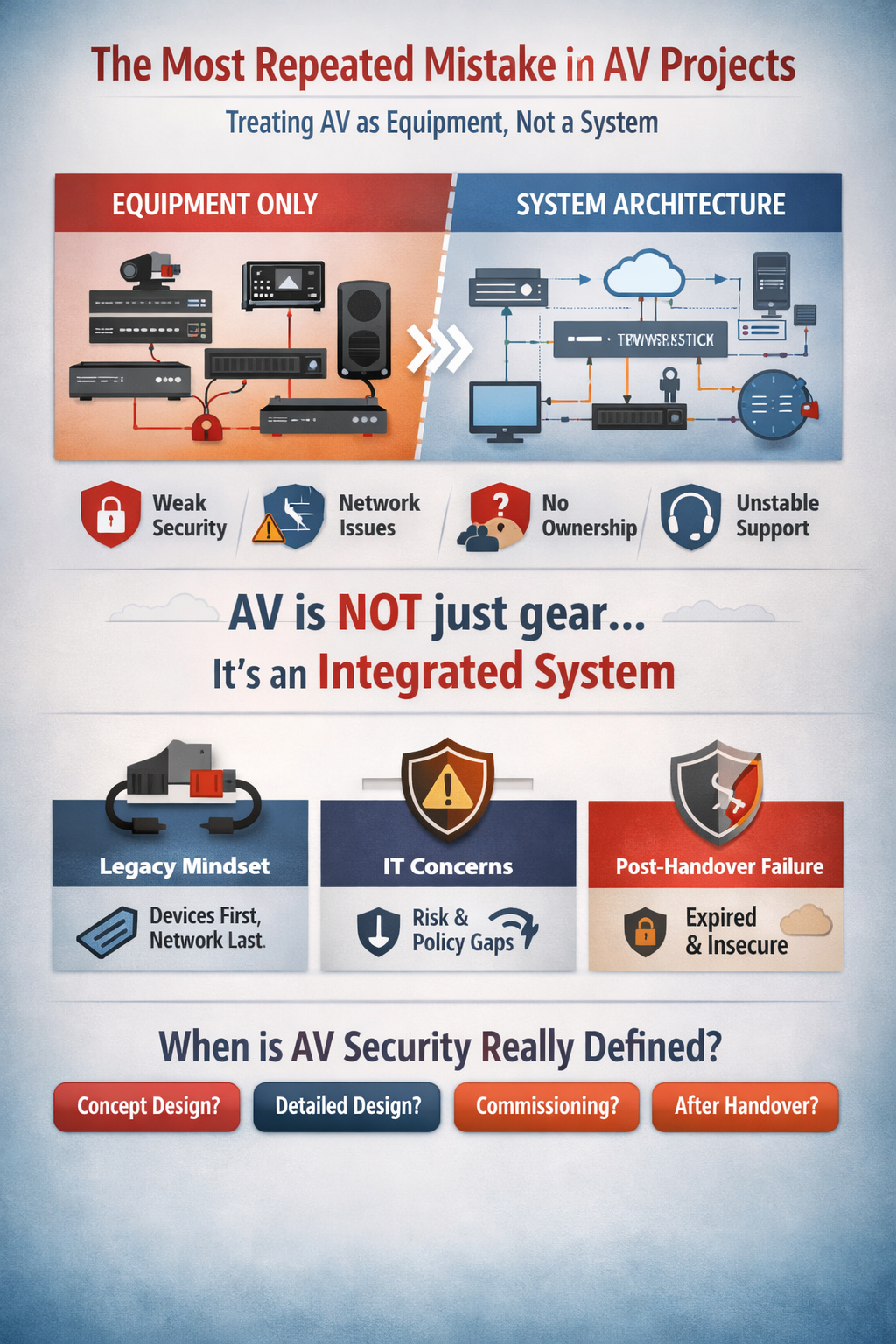 One of the most dangerous beliefs in AV projects is:“We’ll secure it during commissioning.”