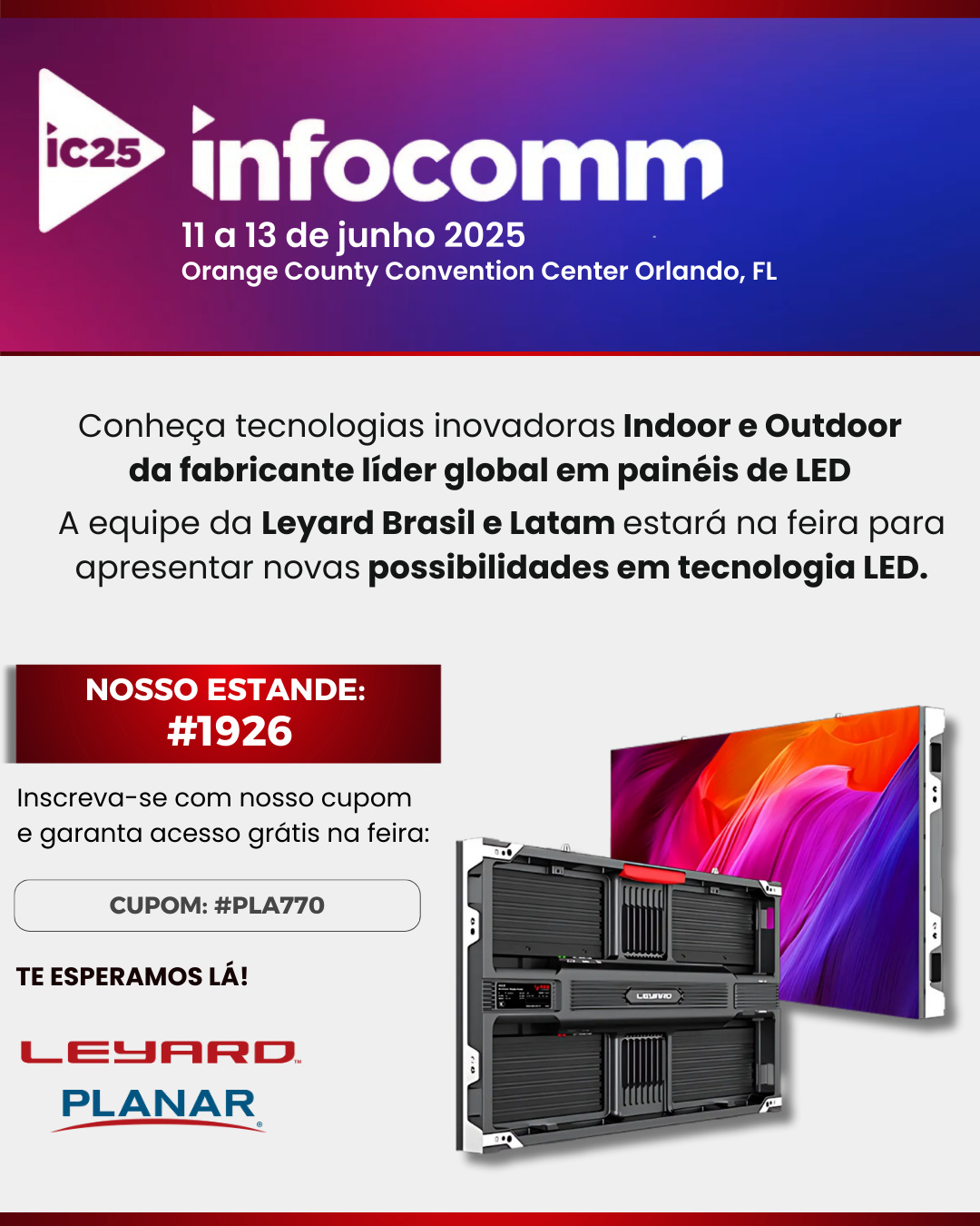 Nossa equipe estará presente para receber nossos parceiros da América Latina e apresentar soluções especializadas para ambientes indoor e outdoor, além de mostrar o que há de mais inovador em tecnologia de painéis de LED.