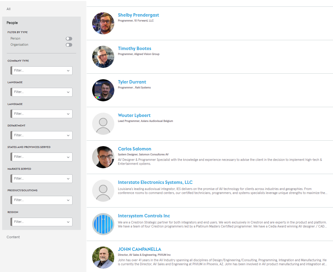Type your search term into the main “Search AVIXA Xchange” field at the top of the page. You could enter a title, a company, a term like “digital signage”…anything. Let’s use “Programmer” as an example. You’ll see a sampling of people and content that match your query, but let’s take it a step further.