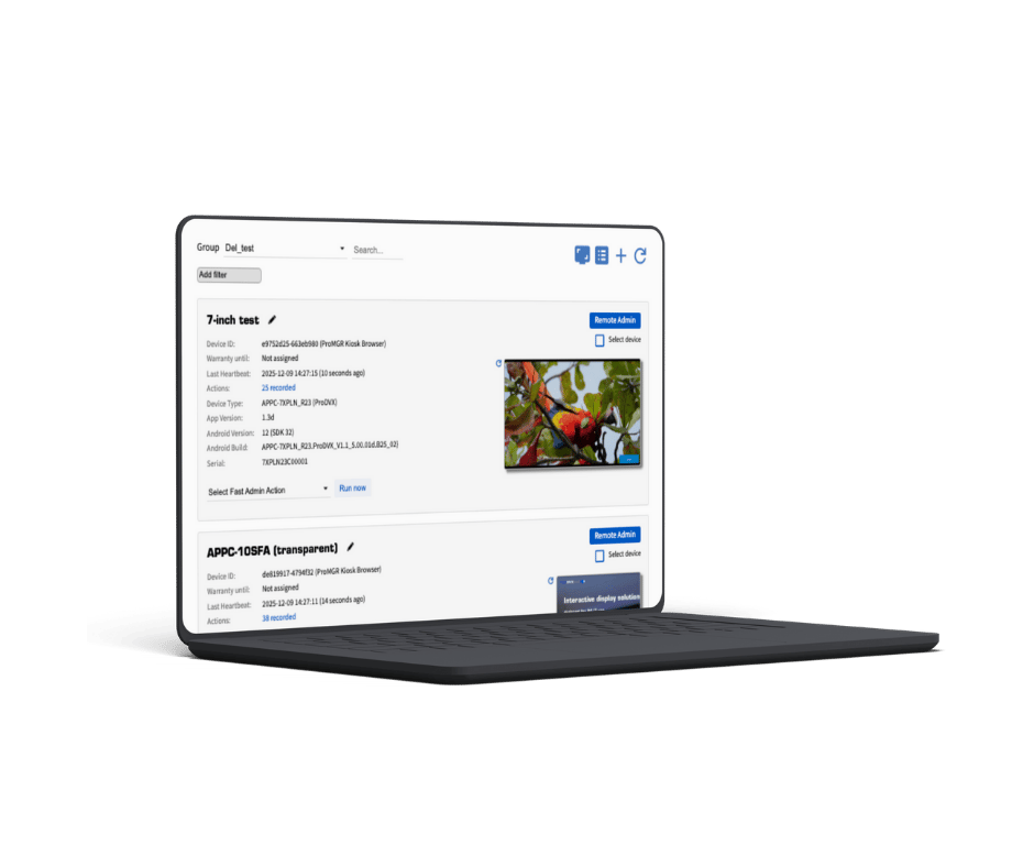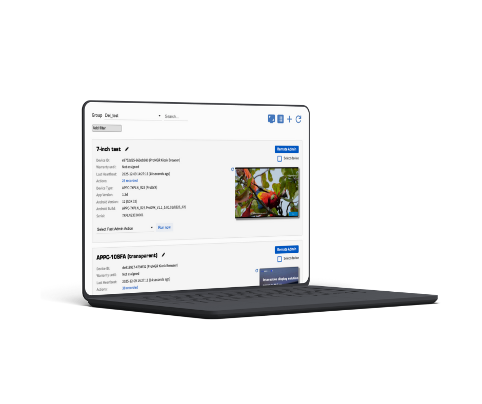 Screenshot Overview provides a fast and visual way to verify that every device in the field is working exactly as intended. With a single click, you can capture up-to-date screenshots directly from your ProMGR dashboard, giving you immediate insight into displayed content, software configurations and overall device status, without needing to be on-site.