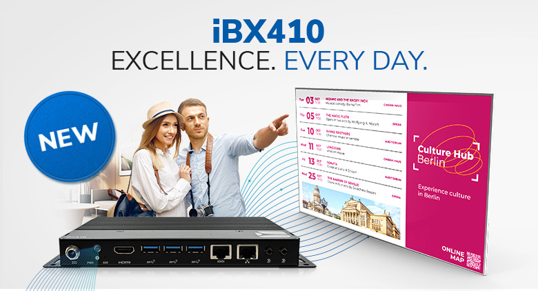 With fanless commercial-grade design, cutting-edge Intel® Atom® processor and DSOS™ – the purpose-built OS for signage by SpinetiX, iBX410 is powerful yet affordable, capable of delivering reliably in any signage scenario.