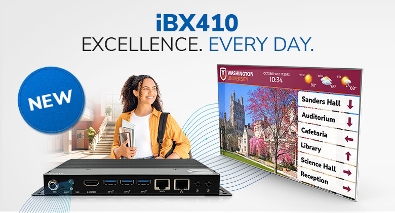 iBX410 is the versatile digital signage player powered by the latest technology that effortlessly meets all your signage needs. Day after day.