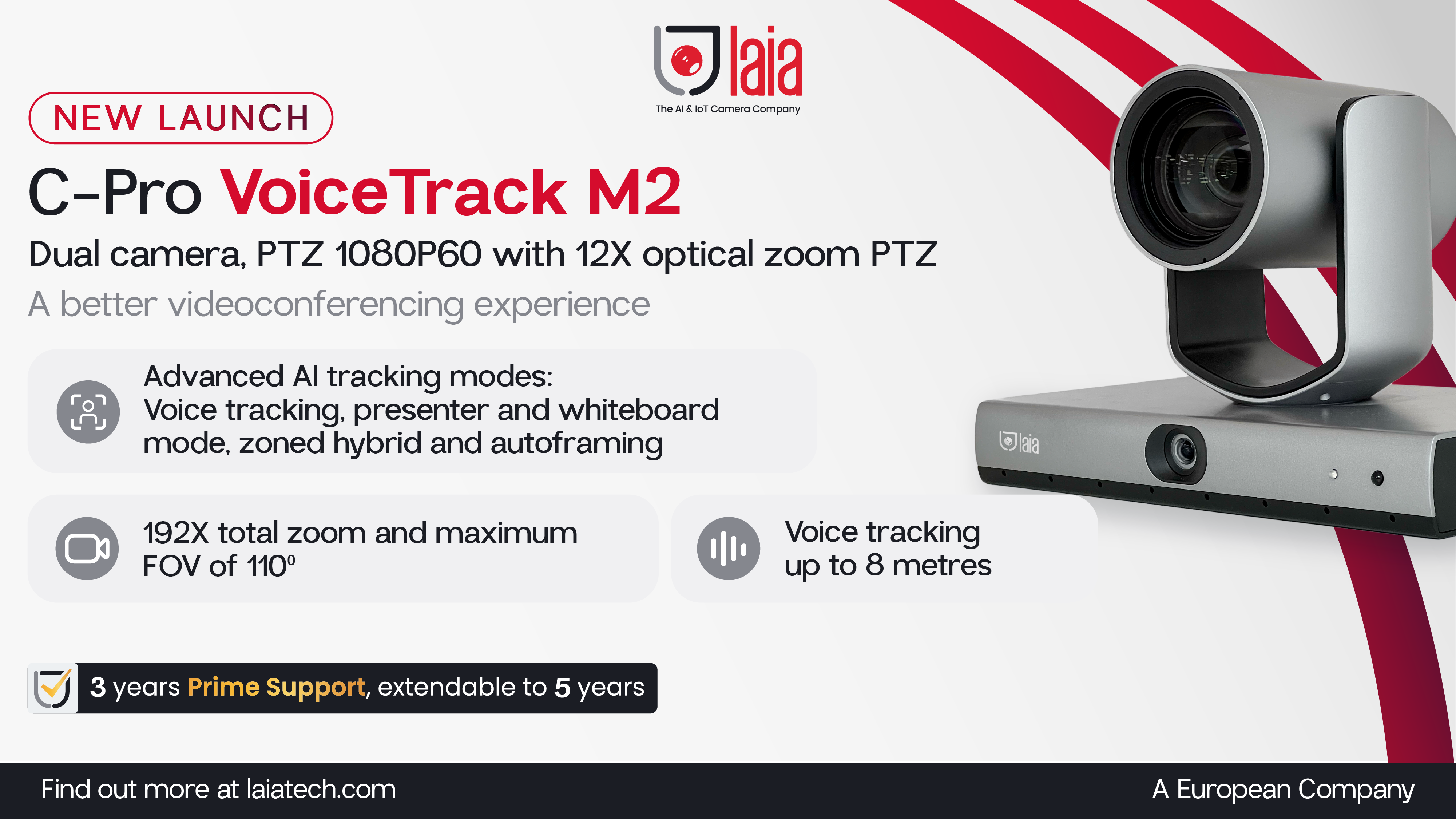 The C-Pro VoiceTrack M2 is a video conferencing camera with autofocus, autoframing and intelligent voice and people tracking with artificial Intelligence. 12X optical and 192X total zoom.
