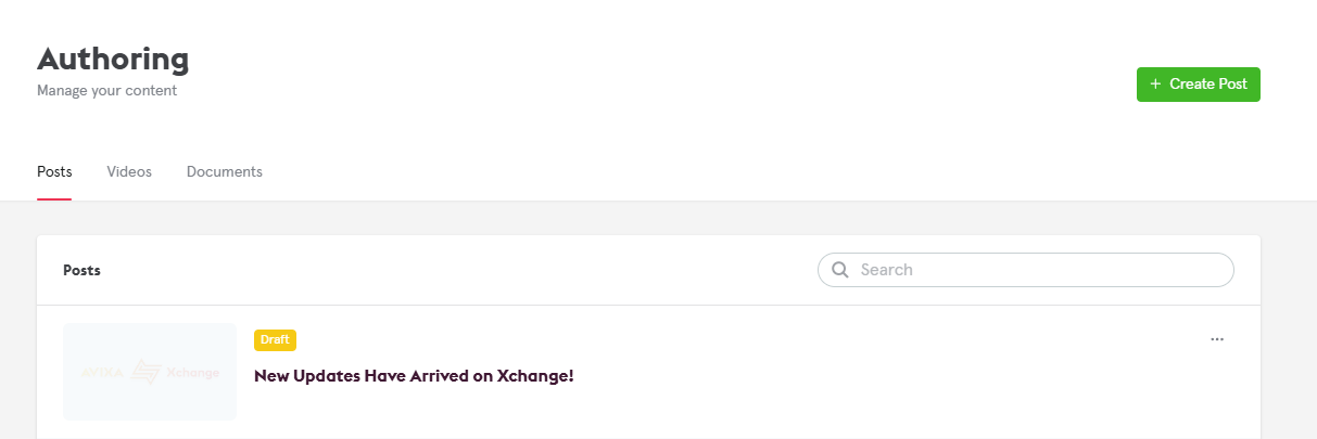 Xchange has also implemented more organization to the Post Authoring tools! Similar to the Rooms improvements, content is segmented by content type, can be searched through with a newly-added search bar, and a clearer indication of the current status of content (Draft, Published, etc.).