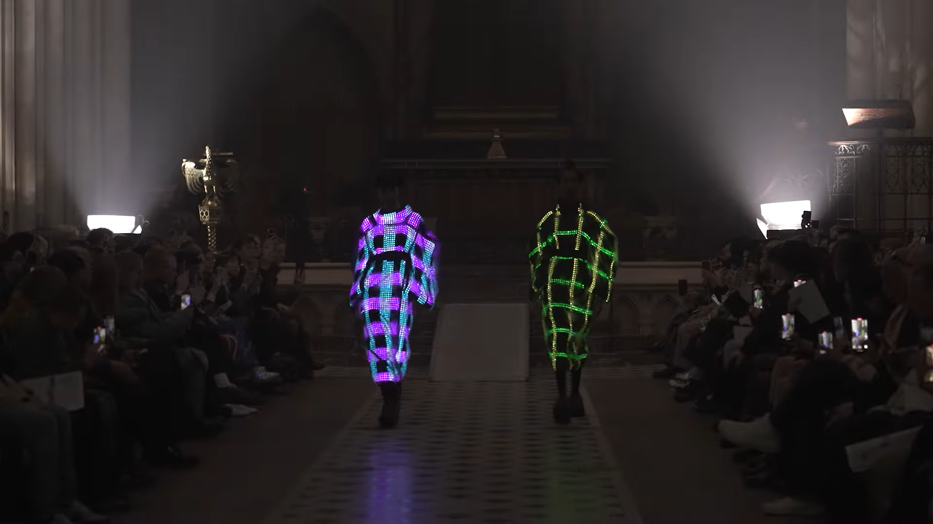 Each LED dress was outfitted with a sensor and battery pack, allowing the display to be controlled from backstage. During the show, models walked side by side as colors swapped back and forth between their dresses.
